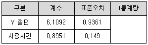 월간 유지비용이 사용시간과 관련이 있는지 여부를 검정하기 위한 t통계량의 값은?