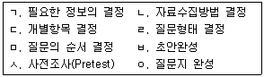 질문지 작성의 일반적인 과정을 바르게 나열한 것은?(오류 신고가 접수된 문제입니다. 반드시 정답과 해설을 확인하시기 바랍니다.)