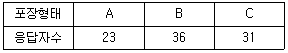다음은 서로 다른 3가지 포장형태(A, B, C)의 선호도가 같은지를 90명을 대상으로 조사한 결과이다. 선호도가 동일한지를 검정하는 카이제곱 검정통계량의 값은?