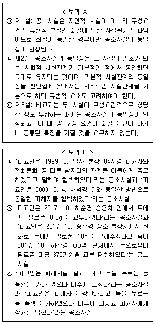 <보기 A>에서 공소사실의 동일성 판단기준에 관한 판례의 입장을 고르고, 이러한 판례의 입장에 의해 공소사실의 동일성을 인정할 수 없는 경우를 <보기 B>에서 찾아 바르게 연결한 것은?