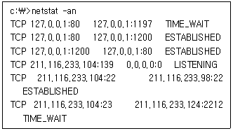 Windows 명령 프롬프트 창에서 ′netstat -an′ 을 실행한 결과이다. 옳지 않은 것은?(단, 로컬 IP Address는 211.116.233.104 이다.)