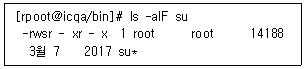 아래와 같이 초기설정이 되어있는 ′/bin/su′ 명령어가 있다. Linux 서버의 내부 보안을 위해 ′/bin/su′ 명령어를 root에게는 모든 권한을, ′wheel′이라는 그룹에게는 실행권한만을 부여하려고 한다. 이 과정 중에 올바르지 않은 사항은?