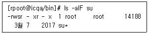 아래와 같이 초기설정이 되어있는 ′/bin/su′ 명령어가 있다. Linux 서버의 내부 보안을 위해 ′/bin/su′ 명령어를 root에게는 모든 권한을 ′wheel′이라는 그룹에게는 실행권한만을 부여하려고 한다. 이 과정 중에 올바르지 않은 사항은?