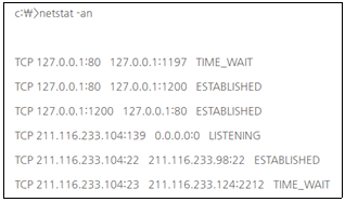 Windows 명령 프롬프트 창에서 ′netstat -an′ 을 실행한 결과이다. 옳지 않은 것은?(단, 로컬 IP Address는 211.116.233.104 이다.)