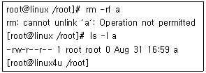 Linux에서 root 권한 계정이 ′a′ 라는 파일을 지우려 했을 때 나타난 결과이다. 이 파일을 지울 수 있는 방법은?