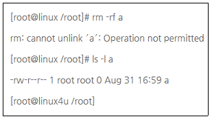 Linux에서 root 권한 계정이 ′a′ 라는 파일을 지우려 했을때 나타난 결과이다. 이 파일을 지울 수 있는 방법은?