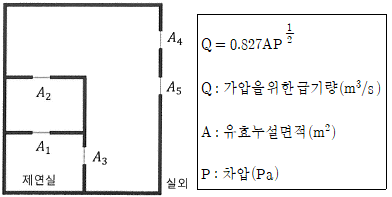 다음 직병렬 복합 누설경로 그림에서 제연실에서의 총 유효누설면적(m2)은 얼마 인가? (단, A1=A2=A3=0.02m2, A4=A5=0.01m2, 소수점 이하 넷째자리에서 반올림한다.)