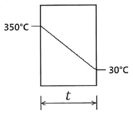 가로 50㎝, 세로 60㎝인 벽면의 양쪽 온도가 350℃와 30℃이고, 벽을 통한 이동열량이 250W일 때 이 벽의 두께 t(m)는? (단, 열전도도는 0.8W/m∙K이고 기타 조건은 무시하며, 소수점 이하 섯째자리에서 반올림한다.)