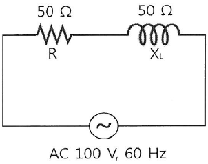 다음 R-L 직렬회로에서 전압의 위상을 0°로 할 때 회로의 전류(I) 및 전류 위상(θ)을 올바르게 나열한 것은?