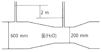 그림과 같이 안지름 600㎜의 본관에 안지름 200㎜인 벤츄리미터가 장지되어 있다. 압력수두차가 2m이면 유량(m3/sec)은 약 얼마인가? (단, 유량계수는 0.98이다.)