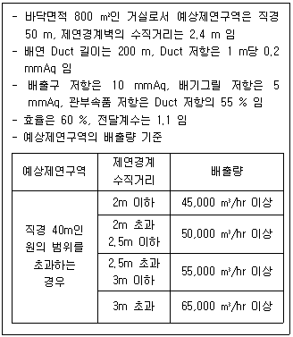 다음 조건의 거실에 제연설비를 설치할 때 배기팬 구동에 필요한 전동기 용량(kW)은 약 얼마인가?