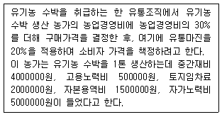 다음 조건에서 유기농 수박의 1kg 당 구매가격과 소비자 가격을 올바르게 구한 것은?