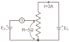 다음 그림에서 검류계의 지침이 0을 지시하고 있다면 미지전압 EX는 몇 V 인가?