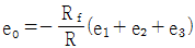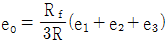 그림과 같이 이득이 A인 연산 증폭기에서 출력전압(eo)를 나타낸 것은?(단, e1, e2, e3 : 입력신호 전압, R1 = R2 = R3 = R이다.)