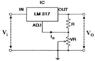 정전압 IC인 LM317은 양(+)의 가변 직류전압을 얻어내는데 사용하는 소자이고 출력단자(OUT)와 조정단자(ADJ) 사이의 기준전압은 1.25V로 정해져 있다. 이 정전압 IC를 사용하여 그림과 같은 가변 전원회로를 구성하였을 때 출력 직류 전압의 가변 범위로 옳은 것은? (단, 고정저항 R은 1kΩ, 가변저항 VR은 25kΩ이고 조정단자에 흐르는 전류는 IADJ는 0으로 간주한다.)