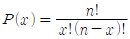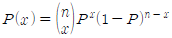 이항분포(binomial distribution)에서 매회 A가 일어나는 확률이 일정한 값 P일 때, n회의 독립시행 중 사상 A가 x회 일어날 확률 P(x)를 구하는 식은? (단, N은 로트의 크기, n은 시료의 크기, P는 로트의 모부적합품률이다.)