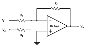 다음 연산증폭기에서 R1=R2=100[kΩ]이고, Rf=25[kΩ], V1=2[V], V2=4[V] 일 때 출력전압 Vo는?