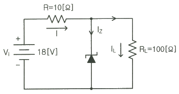 다음 회로에서 제너 다이오드에 흐르는 전류는? (단, 제너 다이오드의 파괴 전압은 10[V] 이다.)