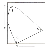 다음 CIE 색상 도표에서 A, B, C 점에 해당하는 색상들이 순서대로 올바르게 나열된 것은?