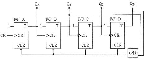 다음 그림은 T F/F을 이용한 비동기 10진 상향계수기이다. 계수값이 10 이 되었을 때 계수기를 0 으로 하기 위해서는 전체 F/F을 clear 시켜야 하는데 이렇게 하기 위해 (가)에 알맞은 게이트는?