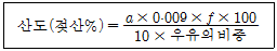검체 10ml로 우유의 산도를 계산하는 다음 식에서 0.009의 의미는? (a : 0.1N NaOH의 소비량(ml), f : 0.1N NaOH의 역가)