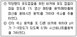 아래의 ①, ② 반응에서 나타나는 색은?