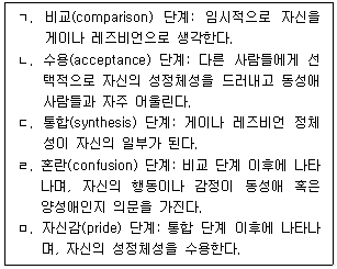 캐스(V. Cass)가 제시한 동성애 성정체성 발달 과정에 관한 설명으로 옳은 것을 모두 고른 것은?