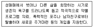 다음은 헤스터(M. Hester)와 웨스트말랜드(N. Westmarland)의 성매매 청소년의 개입전략 중 어느 단계인가?