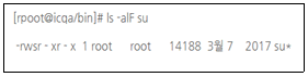 아래와 같이 초기설정이 되어있는 ′/bin/su′ 명령어가 있다. Linux 서버의 내부 보안을 위해 ′/bin/su′ 명령어를 root에게는 모든 권한을, ′wheel′이라는 그룹에게는 실행권한만을 부여하려고 한다. 이 과정 중에 올바르지 않은 사항은?